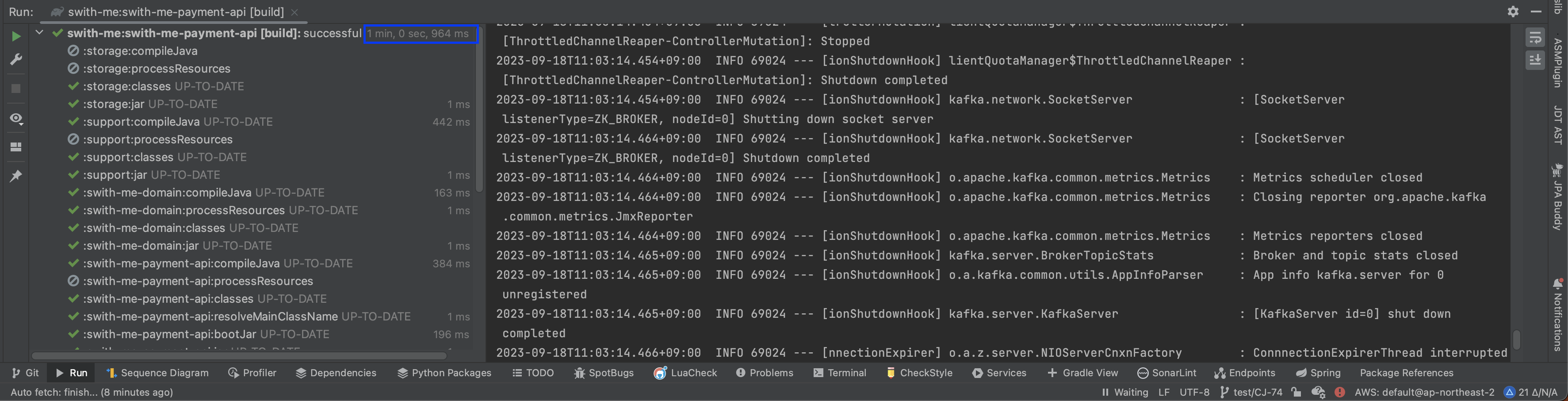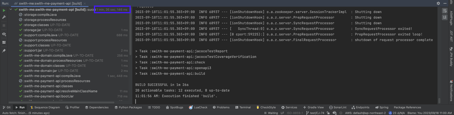 테스트컨테이너의 가장 큰 문제점은 실행 속도입니다. 아래는 약 15개 정도의 통합/문서화 테스트를 포함한 빌드한 시간인데, 1분 26초 정도가 나온 것을 볼 수 있습니다. 만약 테스트가 많아진다면 빌드 속도가 가파르게 증가합니다.